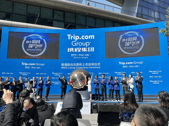 攜程集團今日在上海舉行港股上市儀式,集團董事局主席梁建章和首席執行官孫潔共同敲鑼。(林雯婕攝)