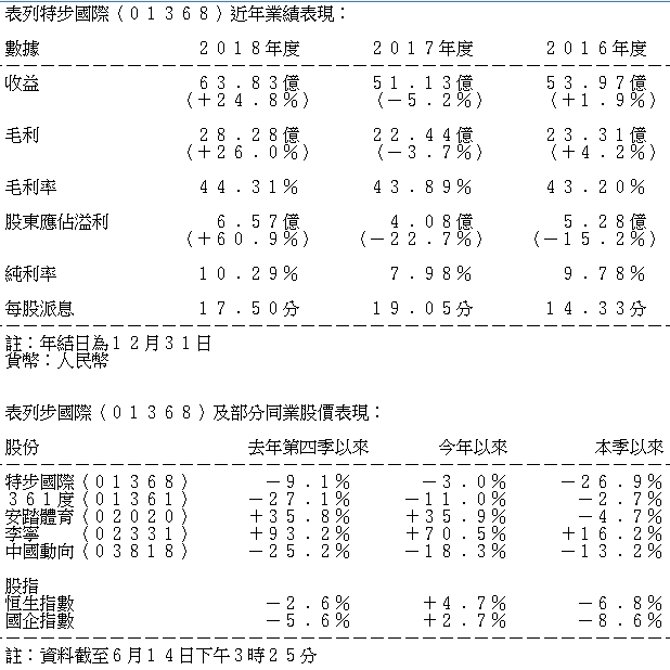除了上述業務發展大計外,特步國際具有復甦概念。該公司在2015年至2017年三年間盈利能力停滯不前,收入和毛利分別處於50多億元和20多億元(人民幣.下同)的水平。2018年終於有所突破,收入增長24.8%至64億元,成功晉級為中國三大本土體育用品品牌及五大全球體育用品品牌。毛利為28億元,經營溢利則突破10億元的水平,純利為6.6億元。毛利率上升至44.3%,為近5年來最高的水平。純利率由8%上升至10.3%,平均股東資金回報率則由8%上升至12.4%。