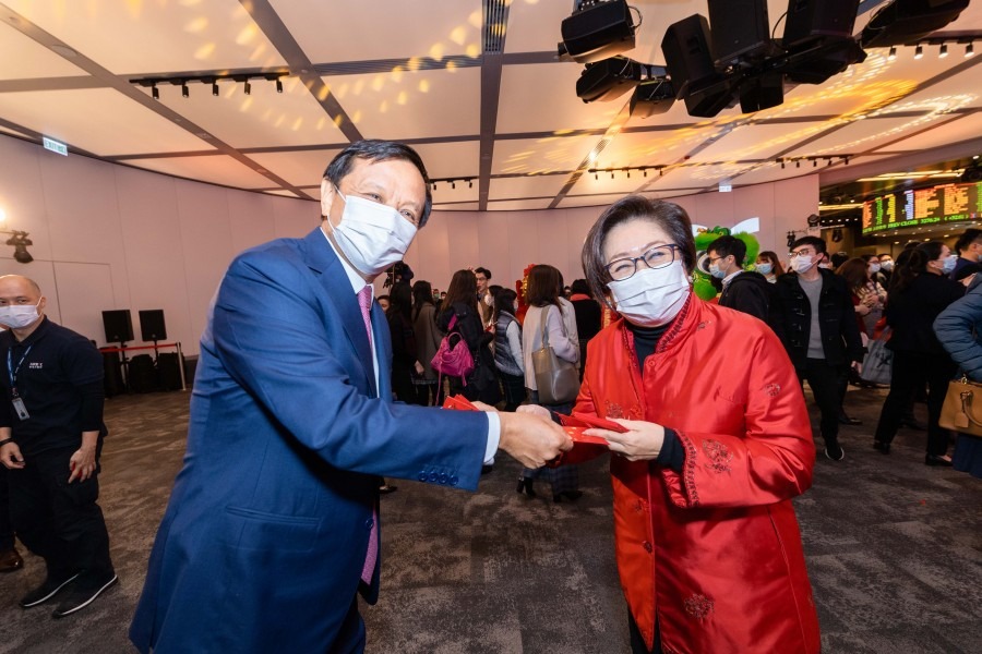 港交所閉門敲鑼迎鼠年 史美倫及李小加齊戴口罩派利是
