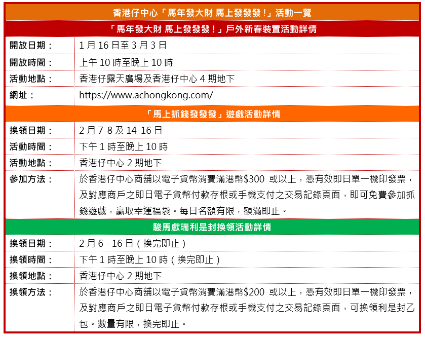 除了一連串滿Fun 爆Luck的新春打卡裝置外,香港仔中心特意趁佳節送上2大「好運滿馬」雙重消費禮遇!於2月7-8及14-16日憑消費即可免費參加抓錢遊戲,贏取幸運福袋,祝願大家駿馬生財,「馬」上行大運! 另外,2月6-16日,只需憑消費更可換領駿馬獻瑞利是封,將誠摯祝福傳遞給摯愛的親友,共迎新春喜悅!
