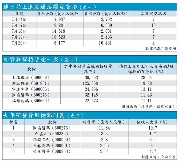 自滬港通開通以來,恒瑞醫藥都是最受外資青睞的股份之一。港交所數據顯示,截至上周二(18日),透過滬港通於中央結算系統的持股量達到3.2億股,佔於上交所上市及交易A股總數的11.4%,比例在各A股中排行第4(見表二)。