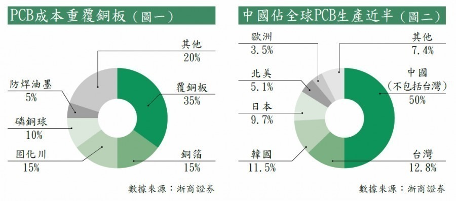 覆銅板由木漿紙或玻纖布浸樹脂後,在表面用銅箔覆蓋,該產品為電子工業的基本材料,主要用於印製電路板(Printed Circuit Board,PCB),不論電視、電腦、手機、移動通訊設備等,低端或高端的電子產品都需要用到,覆銅板佔PCB的製作成本亦達到近三分之一(見圖一)。