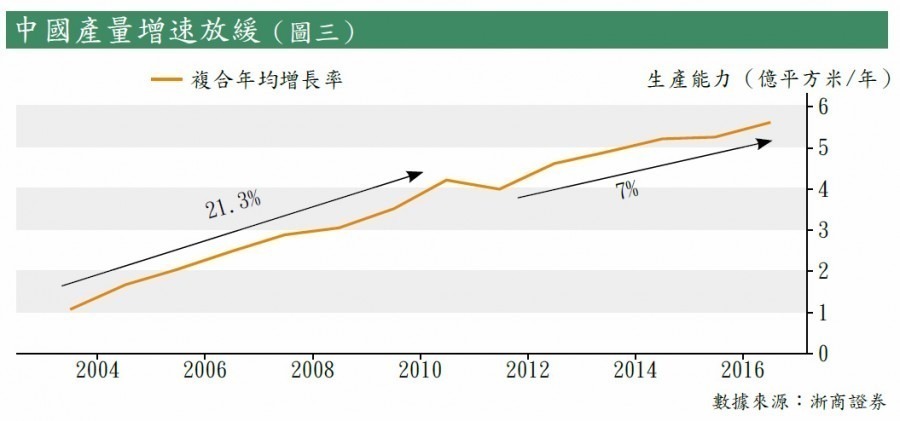 即使2011年到2015年中國覆銅板行業產能持續上升,但較之前增速有所減緩(見圖三),根據浙商證券的數據,一些主要企業的產能利用率達到八成以上,明顯優於行業平均的70%。由於行業排污不少,在環保及去產能等大趨勢下,估計煤炭、鋼鐵板塊「汰弱留強」的情況,同樣會在覆銅板市場出現。