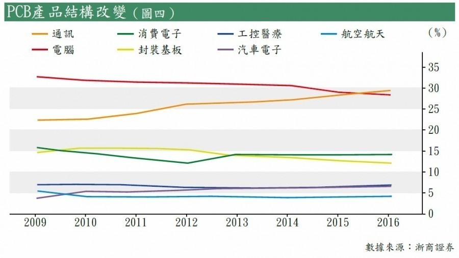 正如上文提及,PCB廣泛應用於各類電子產品,而中國在通信、汽車電子領域的佔比穩步上升(見圖四),由於這些應用的PCB需要高頻、高速、高阻燃等,需要的技術較高,因此可以說,PCB正在帶動覆銅板轉向中高端。