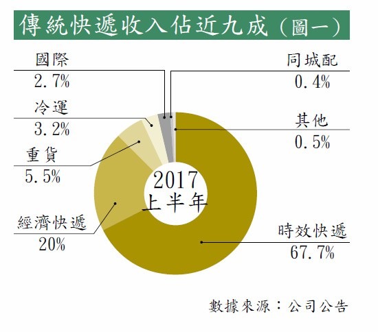 2017年上半年,順豐有67.7%的收入來自對時效要求較高的時效快遞(見圖一),連同經濟快遞,傳統快遞業務已合佔順豐近九成收入。