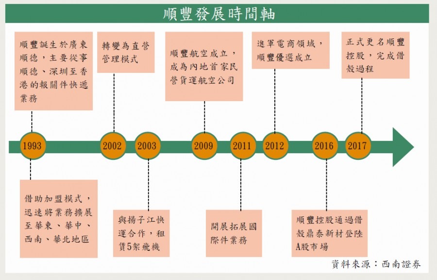 「三通一達」中,除了中通選擇於美國以IPO上市,圓通、申通、韻達都選擇於A股借殼上市。至於順豐,於2016年宣布與鼎泰新材進行重大資產置換,至2017年2月23日正式在深交所上市,並於24日將鼎泰新材更名為順豐控股,證券代碼不變。正式更名前夕,順豐股價已先行起動,由2017年2月20日收報40.05元,一直升至3月1日的73.48元。