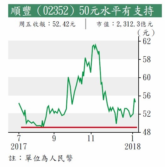 受去年內地股市疲弱所累,順豐股價亦無大起落,但於50元水平有穩固支持,本周則見起動,不妨乘勢於現價52.42元追入,目標看去年高位62.78元,穿前底48.5元止蝕。