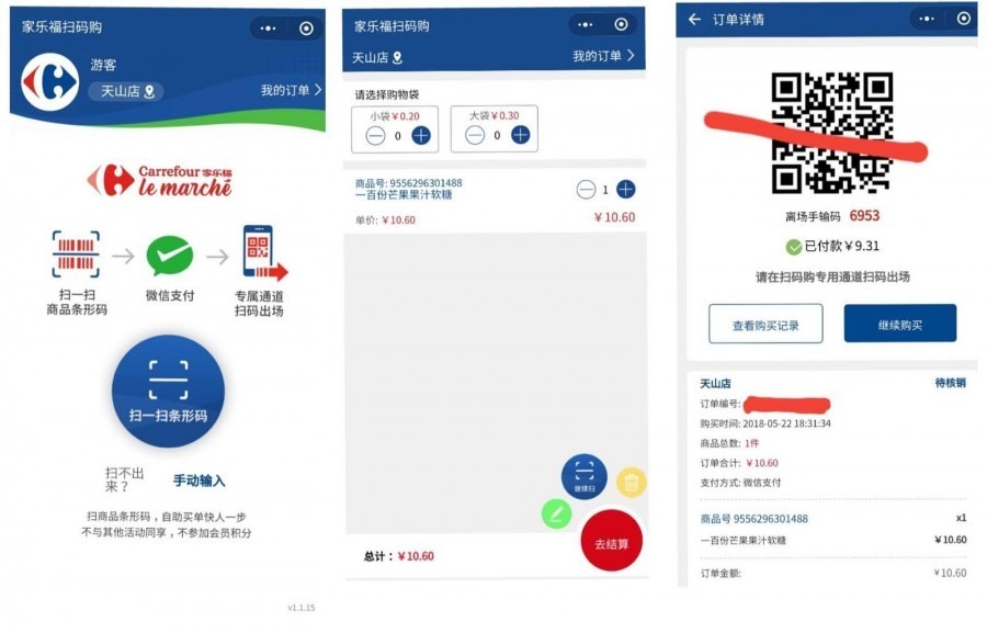 當然,Le Marche最讓外界關注的,就是與騰訊合作的「掃碼購」微信小程序,記者在賣場內以一包糖果實測,先在微信上開啟「家樂福掃碼購」小程序,再用手機鏡頭掃描包裝上的條碼,再按下結算按鈕,便能以微信支付。記者的手機在結帳後會生成一個二維碼,在離開商場時,服務員用掃碼器掃描該二維碼,確認記者已經完成付款,便讓記者離開。