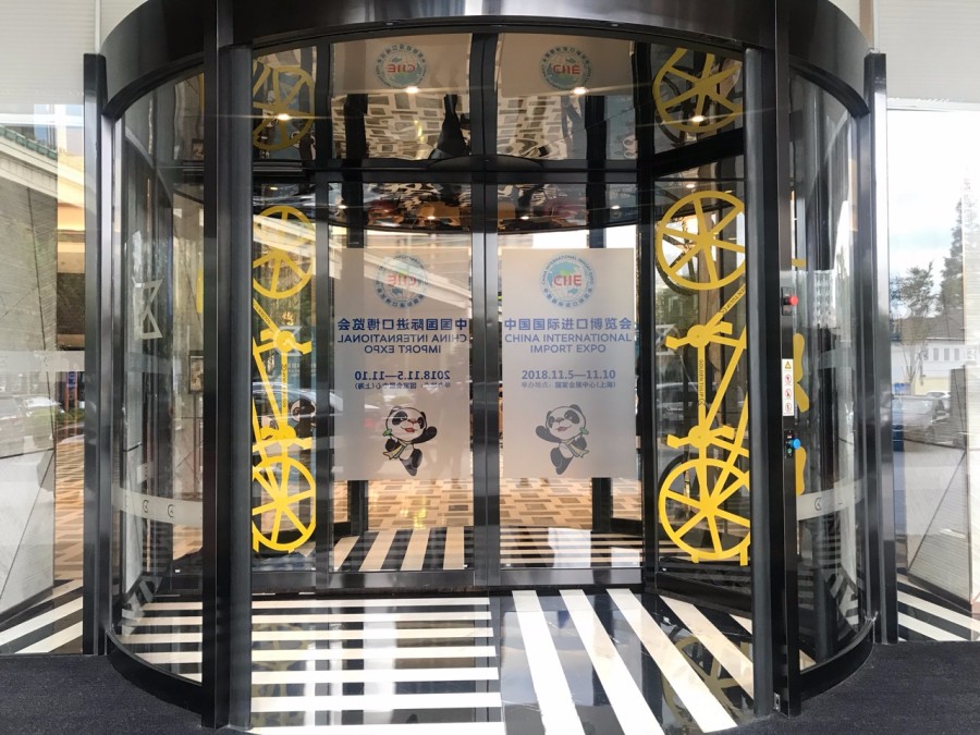 上海虹橋郁錦香賓館的旋轉門添加了進博會的裝飾圖案(林雯婕攝)