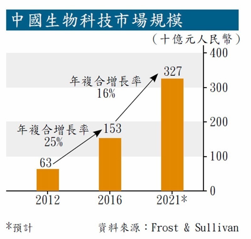 隨著港交所(00388)今年允許暫未盈利的生物科技公司申請上市,全球其他交易市場亦開啟相關的IPO綠色通道,生物科技逐漸成為投資市場的新寵。弗若斯特沙利文公司(Frost & Sullivan)報告顯示,過去五年中國生物科技市場發展迅速,由2012年的627億元人民幣上升至2016年的1527億元人民幣,年復合增長率達25%。