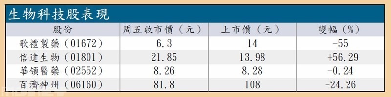 港交所實施上市新例半年後,12家生物科技企業先後提出申請港股上市,當中4家已完成上市,包括歌禮製藥(01672),百濟神州(06160),華領醫藥(02552)和信達生物(01801)。不過,已上市的生物科技企業股價卻不盡人意(見表)。截至12月7日,除信達生物外,其他股價均跌破招股價,歌禮製藥的跌幅更超過5成。