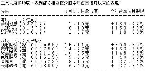 A6:美瑞健康(02327)2月成立了聯營公司,開拓工業大麻提取物霧化液的研究、開發、銷售及其醫療應用;雄岸科技(01647)於3月宣布,在黑龍江與當地企業合作種植工業大麻;比速科技(01372)上月宣布,旗下生物科技公司獲批進行工業大麻加工和項目建設。