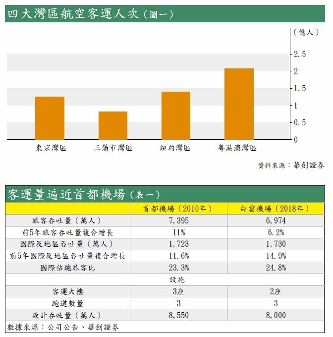 華盛證券的研究指出,現時白雲機場的各項指標相似於2010年的首都機場(見表一),而以當年的首都機場增長速度作模組,預測白雲機場在2025年時旅客吞吐量將可達1.1億,國際旅客將達到3,760萬人次,期內國際旅客年複合增長11.7%,與2018年浦東機場國際旅客人數接近,此項預測與廣東機場集團規劃相若。
