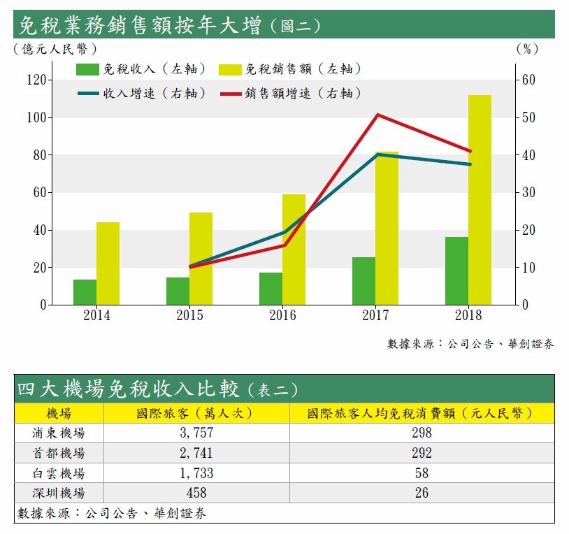 2018年白雲機場免稅店收入佔機場盈利的比例約為2%,比北京首都機場的22%實為「九牛一毛」。2018年機場的人均免稅消費額升至約58元(人民幣.下同)(見圖二),券商預計今年的人均免稅消費額將達100元,預計能達首都機場和浦東機場的三分一左右(見表二)。而從機場當局積極尋找方法打破國旅在一號客運大樓的壟斷,從而模仿首都機場盈利模式,可證白雲機場發展潛力巨大,亦不難解釋自公布上半年業績後公司股價一直穩步上揚,表現領放上證。