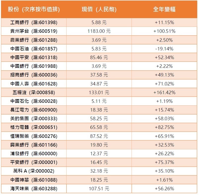 滬指回春,市值20大A股之中,除了中國石油(滬:601857)外,其他全數上升,部分更見顯著升幅,外資鍾愛的「白酒雙雄」尤甚:股王貴州茅台(滬:600519)年內股價破千元,周二收市報1183元,按年上漲整整1倍,至於五糧液(深:000858)表現更強勢,周二收市報133.01元,較上年增長1.61倍。