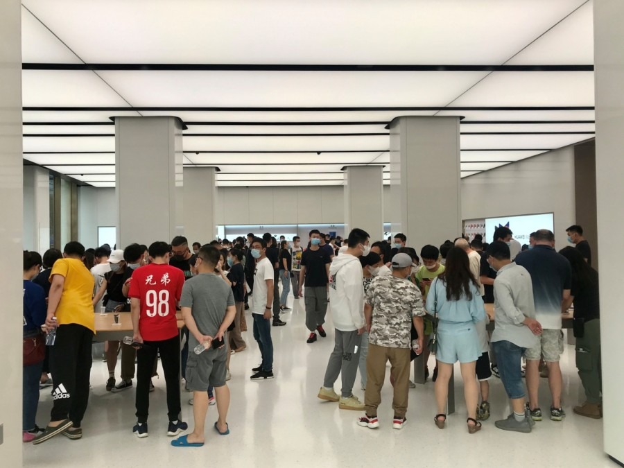 雖然店門口拉起了排隊的隔離繩,但進店並不需要排隊太久。走入店內,看到大塊的落地玻璃窗、一張張原木色的桌子上擺著手機、平板電腦等數碼產品,周圍白色的墻上鑲嵌著大塊廣告屏,有一種進入蘋果商店的錯覺。(林雯婕攝)
