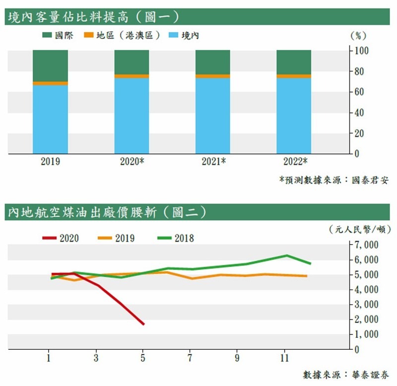 此外,參考深圳民航運輸的數據,上周深圳空管日均航班量達808架次,即已恢復至去年日均約八成。而鑑於海外疫情持續,國際需求料需較長時間回復,國泰君安預計未來數年,境內綫的佔比亦會提高(見圖一)。