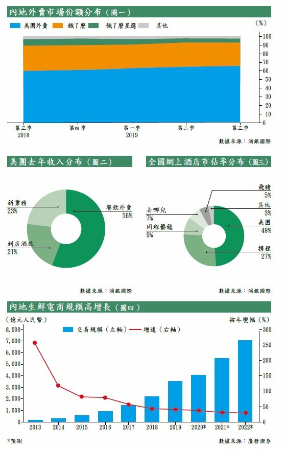 除了外賣,美團亦稱霸全國網上酒店市場,取得近半市佔率(見圖三),拋離對手携程及同程藝龍(00780)。目前酒店業務收入雖不及外賣,以2019年第四季計卻成功提供58%毛利,較外賣的29%為高。美團透過手機應用程式及大眾點評提供到店酒旅的一站式服務。用家除了可以預訂住宿酒店及參觀景點和遊樂園,亦可同時預約醫療、親子及課程等日常生活相關的服務,滿足吃喝玩樂的需求。大行預期,美團到店酒旅的收益結構將由以往的佣金模式,轉向營銷模式,利用商家推介推動廣告價值,實現高收入增長。美團酒店業務無疑亦不能倖免於早前的疫情,惟鑑於其主打低線城市的酒店業務,復甦速度相信較主攻商務旅遊,以一線城市高端酒店為主要合作對象的携程為快。