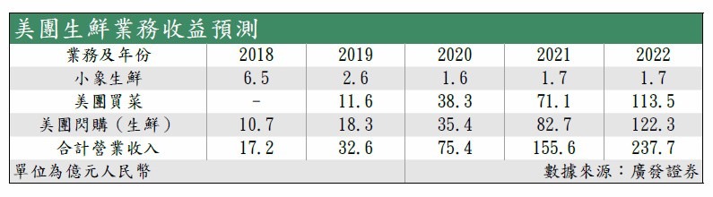 集團以自營結合平台形式發展生鮮電商,自營業務方面,集團前年推出的「小象生鮮」因門店營運成本高昂,影響投資回報下終要收縮,去年起改以網上自營前置倉模式,推出「美團買菜」。新冠疫情期間,美團買菜在北京、上海、深圳及武漢等市站點銷量全線上漲。平台業務方面,美團前年開啟「美團閃購」業務,為實體零售店提供到家運送服務以收取不同費用。今年4月,美團閃購應用程式升級為「菜大全」,主打蔬菜水果。廣發看好,美團買菜有力於5年後在全國前置倉市場成交金額,取得25%市佔率,成為業績增長重點。該行看好其自營結合平台模式,可受惠於滲透率上升,推動生鮮電商業務收入呈現倍數式增長(見表)。