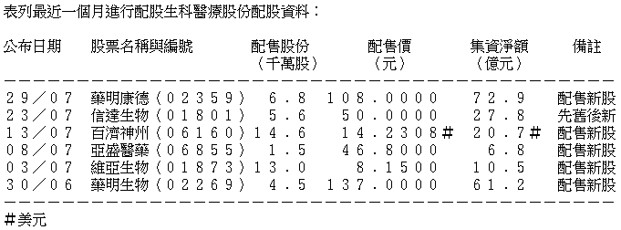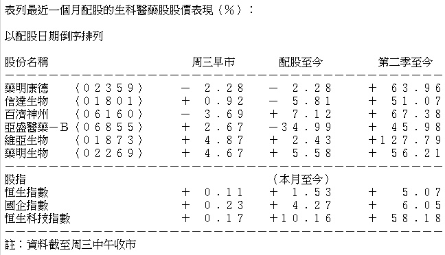 據記者統計,截至周三,過去一個月一共有6隻生科醫藥股配股,包括藥明康德、信達生物(01801)、百濟神州(06160)、亞盛醫藥-B(06855)、維亞生物(01873),以及與同屬藥明系、藥明康德子公司--藥明生物(02269)。有趣的是,藥明生物正正於一個月前,6月30日配股。