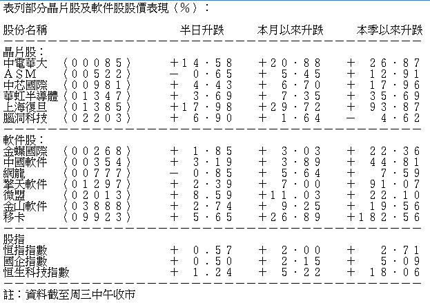 半導體股自上月中芯(00981)回A熱潮退卻,經歷一輪調整後,近日再展升勢,最新受惠於內地加強支援集成電路及軟件產業發展。根據國務院印發的文件指出,將出台八大政策措施,包括向相關企業提出免徵企業所得稅,及鼓勵全球合作。晶片股當中以上海復旦(01385)走勢最凌厲,半日飆近一成八;軟件股包括金山軟件(03888)及金蝶(00268)亦獲提振。