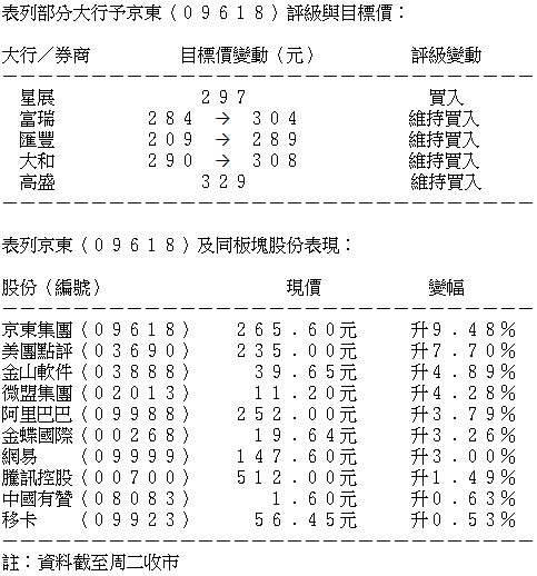 【京東火熱】京東績佳股價抽升逾9% 高盛最牛目標上望329元