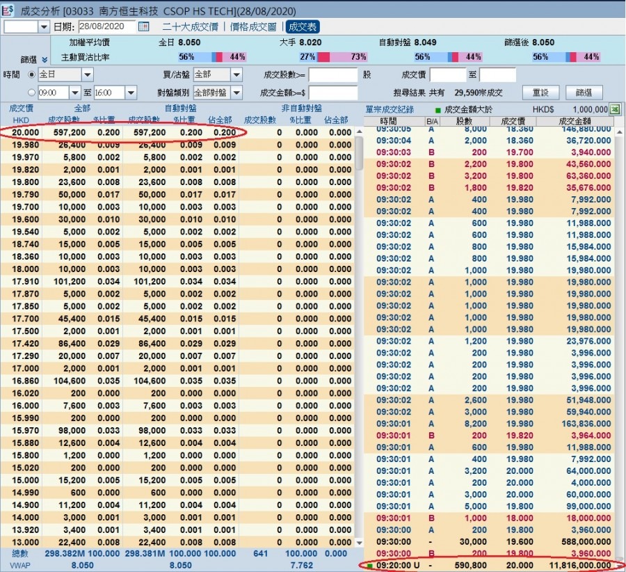 南方恆生科技(03033)於競價時段,20元成交了約59萬個單位,涉及逾1180萬元。(經濟通HV2系統截圖)