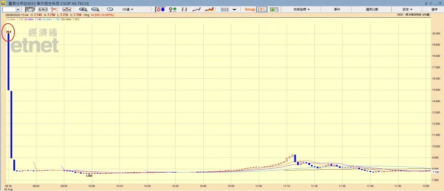 首隻恆生科技指數ETF-南方東英恆生科技指數ETF(南方恆生科技)(03033)今日登場,開報20元,大幅高於上市起始價格約為7.5元,惟在開市兩分鐘內股價旋即下滑至約7.8元。南方恆生科技半日收報7.8元,較每基金單位資產淨值有約2%溢價。專家提醒,ETF有別於一般熱炒IPO,買賣價格應參考ETF的實時資產淨值變化,不應在開市後即追入。