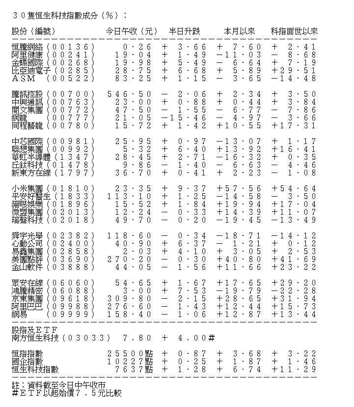 最終,南方恆生科技半日收報7.8元;成交約2.50億股,涉資20.24億元,為半日成交第五大個股。而恆生科技指數報7637,升96點或升1.28%。