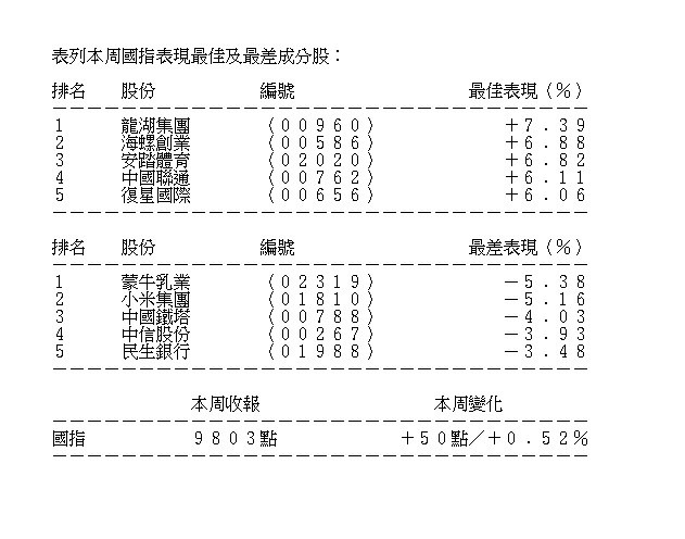 總結一周,港股在24250點至24829點區間波動,上下波幅只有578點,全周跌47點或0.2%。日均主板成交約1160.71億元,較上周少6.32%。國指收報9803點,全周升50點或0.52%,在9688至9879之間波動。科指收報7371點,全周升193點或2.7%,在7232至7464之間上落。