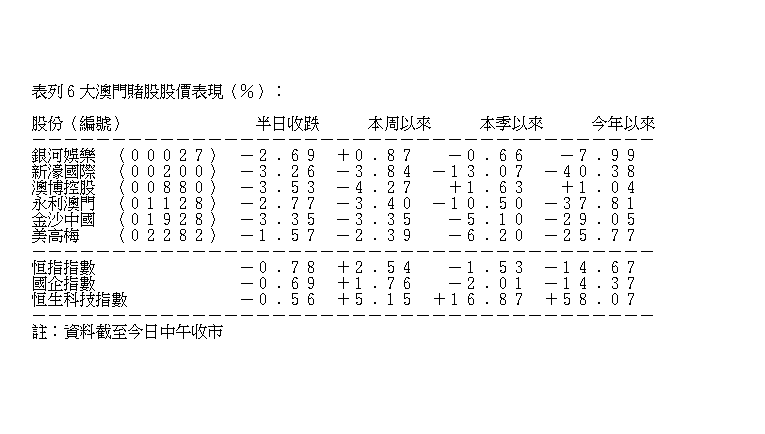 澳門自今年9月下旬開放全國居民辦理入澳自由行簽證,惟長達八日的國慶黃金周未能成功吸引內地民眾赴澳門。濠賭股令早普回落,跑輸大市,六大主要賭股中,以金沙表現最遜色,半日跌3.35%,報28.85元,盤中低見28.55元,創今年五月以來新低;另一藍籌賭股銀娛(00027)亦瀉2.69%,報52.4元,失守250天線(53.15元);澳博跌3.53%,報8.74元;永利澳門挫2.77%,報11.94元。