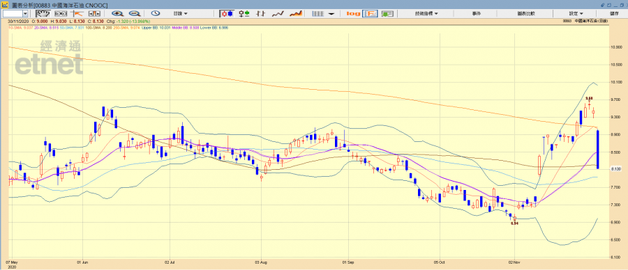 中國海洋石油(00883)跌13.97%,報8.13元。(經濟通HV2系統截圖)