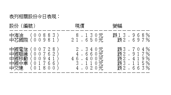 受消息拖累,中海油(00883)股價全日急跌13.97%,報8.13元,成交約3.84億股,涉資32.19億元,全日市值大跌589.3億元,最新只有約3230億元。中芯國際H股跌2.7%,報21.65元,成交約1.17億股,涉資25.56億元;A股(滬:688981)收59.25元人幣,仍升0.54%。