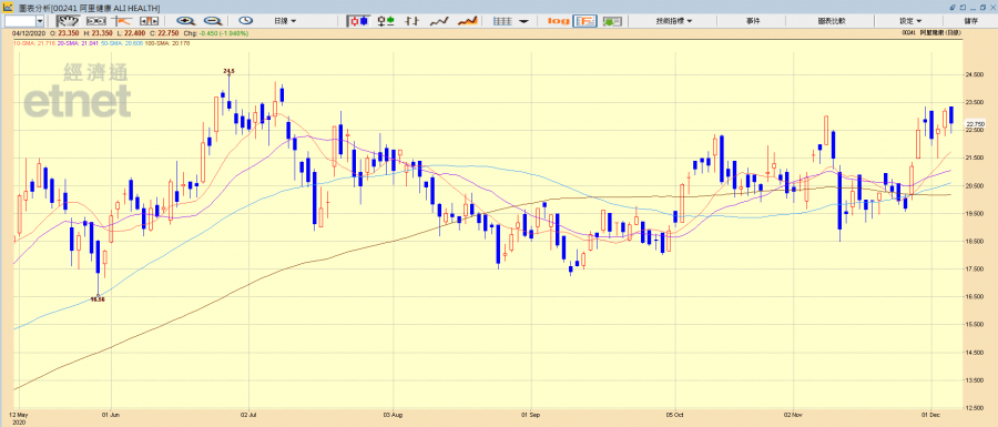 近期坊間比較京東健康與阿里健康時,往往褒京東而貶阿里,認為京東健康盈利基礎較佳,但其實阿里健康剛剛轉虧為盈,盈利增長的爆發力應該較大。阿里健康本身業績理想,而京東健康認購反應理想,應該有利阿里健康股價短期內繼續在高位徘徊,可望挑戰年中高位24.5元。