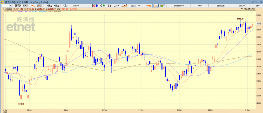 港股本周先跌後升,首先周一(10月30日)有消息指美國總統特朗普或將把中芯國際(00981)及中海油集團等4間中資企業,列入與中國軍方有關聯的制裁黑名單,市場憂慮中美關係轉差,大市周一終止六連升下跌553點收報26341點,跌穿10天線。惟周二(12月1日)正式踏入12月,市場憧憬即將有新冠病毒疫苗推出,且美國經濟刺激措施出台有進展,港股反彈逾二百點重上十天線(約26639點)。惟之後多日大市持續整固,未能完全收復本周初段跌勢。港股本周最終收報26835點,全周累計跌58點,微跌約0.2%。
