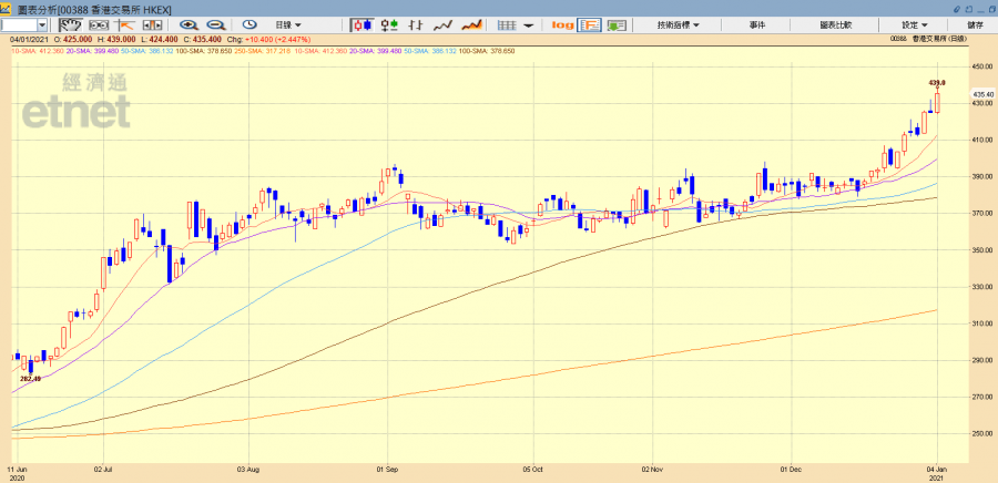 港交所創出上市新高439元。(經濟通HV2系統截圖)