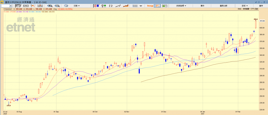 港股於牛年首個交易日「開門紅」,再創2018年六月中以來新高,大市續由科網龍頭主導,京東集團(09618)公布分拆京東物流於主板獨立上市,預期京東物流發展因獨立上市而增加,而京東集團作為京東物流控股股東亦獲益。京東集團近日強勢,半日升近6%,暫連升4日累漲逾一成,曾見415.8元再創新高,令投資者對其後市表現有所憧憬。