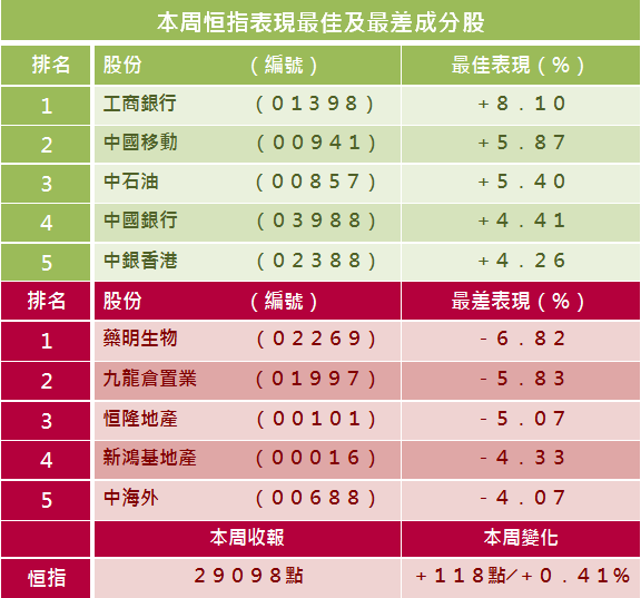 恒指本周在28513至29912點間波動,上下波幅1398點,全周升118點或0.41%,收29098點。國指上下波幅626點,全周升45點或0.4%,報11292點。科指表現最差,本周在8384至9629點間波動,上下波幅1244點,全周跌320點或3.58%,報8634點。