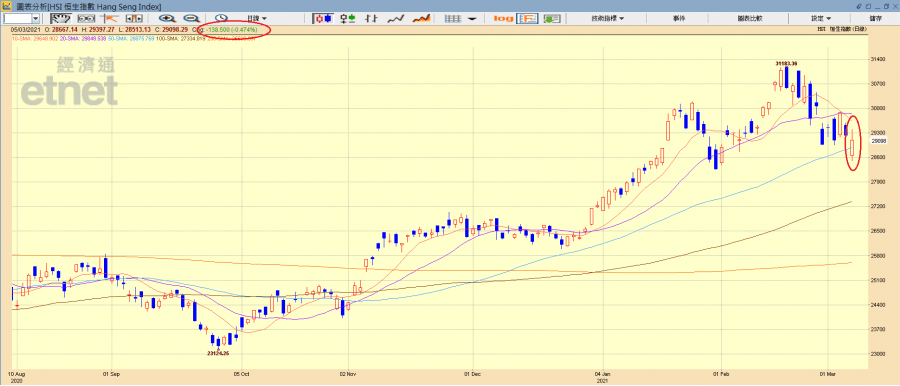 今日,受累鮑威爾無提及開啟「扭曲操作」行動,壓低長債利率,科技科早段沽壓較重,恒指開跌569點報28667點穿五十天線後,一度跌幅擴大至723點,惟受惠中國今年GDP增長目標為逾6%消息,內需及內銀股造好,恒指曾倒升最多160點,港股全日反覆收跌138點。