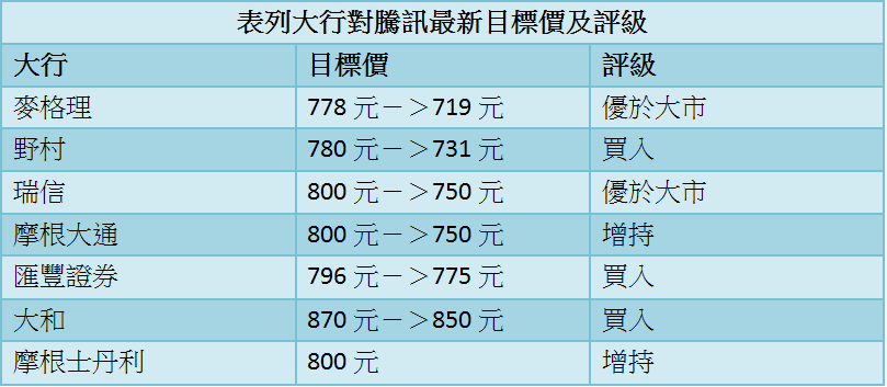 【騰訊績後】大行憂慮騰訊加大投資將拖累盈利表現 紛紛削目標價