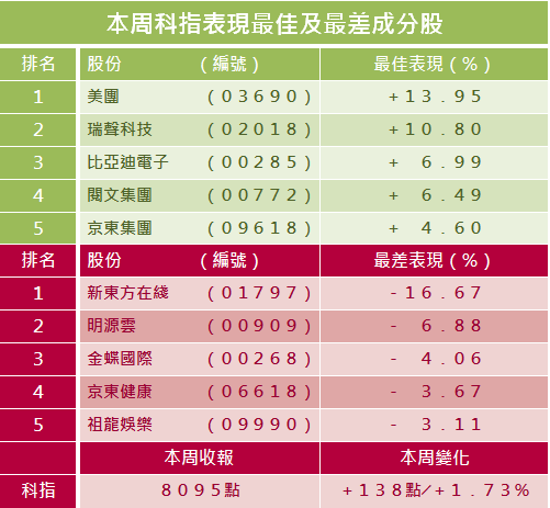 美國科技股造好,帶動港股科技股板塊一同抽升,美團(03690)業績造好並獲大行唱好,股價本周升13.95%,報302.2元;騰訊(00700)本周升1.66%,報611.5元;小米(01810)本周升3.32%,報29.55元;京東集團(09618)本周升4.6%,報295.4元;阿里巴巴(09988)本周升1.35%,報210.2元。