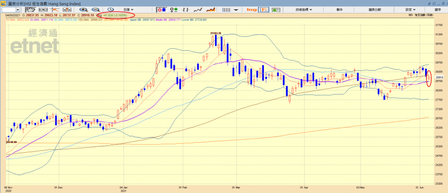 5月最後一個交易日(31日)窄幅波動,高開逾百點後下挫,但科技股走勢向好,刺激港股拗腰反彈高27點;周二(1日)港股顯著反彈,並升至29480的三個月高位,美團(03690)股價造好帶動市場氣氛,恒止最終收漲316點;周三(2日)港股終現回吐,受美股及A股拖累下,恒指升近3個月高位後隨即回吐,最終全日跌170點;周四(4)傳來消息指,針對網絡平台利用大數據?熟客問題將被罰款,科技股全面回吐,拖累恒指大跌331點並失守二萬九關口。