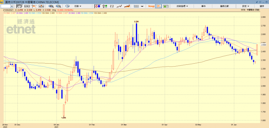 中電信(00728)今早(21日)公布計劃提高派息比率,增派中期息,有望吸引長線投資者,即時刺激股價,半日逆市急漲近9%報2.53元,並且帶動同業中聯通(00762)及中移動(00941),分別升逾1%及近3%,中聯通主要股東中國聯通(滬:600050)早市則跌1.55%報4.46元人幣。