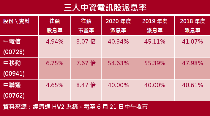 中電信向來不派發中期息,只派末期息,財政年度年結日為每年12月31日。據經濟通HV2系統資料顯示,中電信2020年度派息10.489分人幣,派息比率為40.34%;而2019年度及2018年度派息率分別是45.11%及41.07%。換言之,中電信2021年度派息比率較前三年最少增加15至20個百分點。