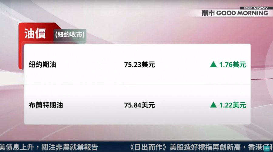 紐約期油隔晚收報75.23美元,創逾兩年半新高。(《開市Good Morning》截圖)