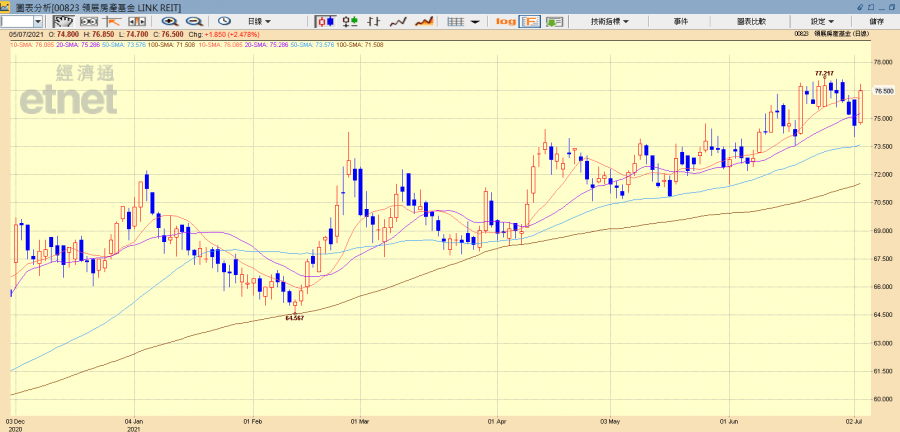 領展今日收升2.48%,報76.5元 。(經濟通HV2系統截圖)