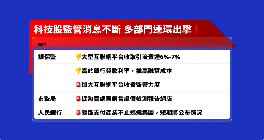 內地多個監管部門連聲喊話,強調加強科網巨企監管。銀保監表示,大型互聯網平台收取引流費達6至7%,高於銀行貸款利率,從而推高融資成本,將加大互聯網平台收費監管力度。市監局則要求阿里巴巴(09988)旗下淘寶、拼多多等平台,處置銷售虛假檢測報告網店。更令市場不安的是,人民銀行表示,壟斷支付產業不止螞蟻集團,其他機構也有同樣情況;對螞蟻集團採取的措施,將會推行到其他支付服務市場主體,短期內將公布詳情,意味未來將有更多科企面臨監管。