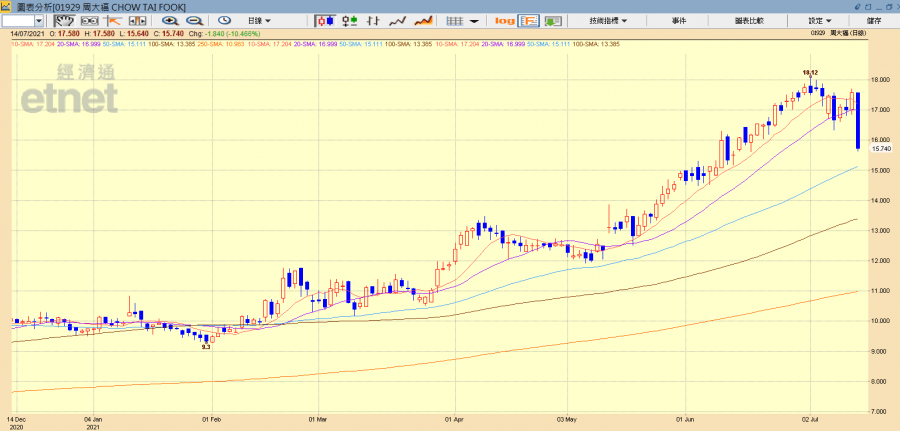 周大福股價跌穿十天及廿天平均線(經濟通HV2系統截圖)