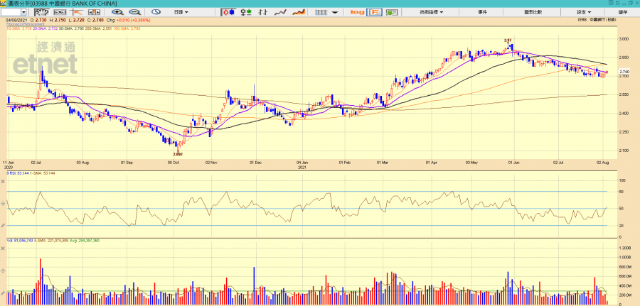 中國銀行日線圖股價走勢。(經濟通HV2系統截圖)