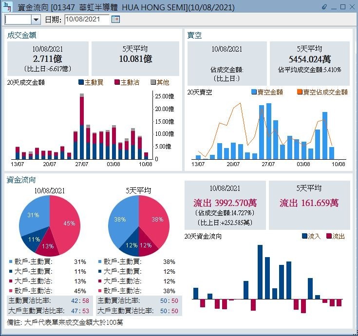 華虹半導體亦出現走資跡象。半日股份錄得約3993萬元資金淨主動賣出,較過去五天平均的約162萬元顯著增加。不過,大戶主動買沽比率為47:53,雖然數據不理想,但表現仍優於中芯。